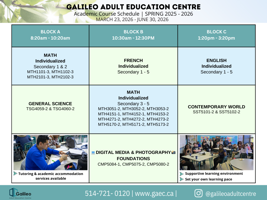 Galileo Adult Centre will be taking a spring break from March 2 to 6, 2026. We will be back, refreshed and ready, on Monday, March 9, 2026